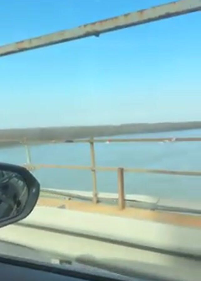 view from inside a car traveling across a bridge. The sky is clear and blue, and the river below is wide and calm. The bridge has metal railings and a concrete base. The car's side mirror is visible, reflecting part of the bridge structure. The interior of the car is also visible. The car appears to be moving steadily across the bridge.