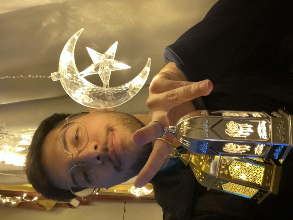 A male individual, appearing to be a young adult, with dark hair, a short beard, and a mustache, is shown from the chest up, looking directly at the camera with a slight smile. He wears clear-framed, octagonal glasses and a dark blue long-sleeved garment. His right hand is raised, holding two illuminated decorative lanterns by their keyrings; one is gold-colored with geometric patterns, and the other is silver-colored with crescent, star, and calligraphic cut-outs. In the upper right quadrant, a translucent, textured, illuminated crescent moon and star decoration hangs by a chain. The background is softly lit with warm string lights, indicating an indoor, possibly festive, environment. The specific location within Sarouja Municipality, Syria, is not discernible from the visual content of the image.