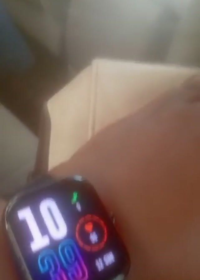 A person is sitting in a car, holding a clutch purse. The person is wearing a smartwatch that displays the time as 10:39 and a heart rate of 96. The hand is visible and has white-tipped nails. The interior of the car appears to be light-colored.