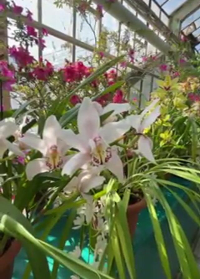 close-up of white orchids with purple and yellow speckles, potted in terracotta pots. The orchids are surrounded by lush green foliage. In the background, there are pink azaleas and yellow flowers. The setting appears to be a greenhouse or sunroom with a glass roof allowing natural light to illuminate the plants.