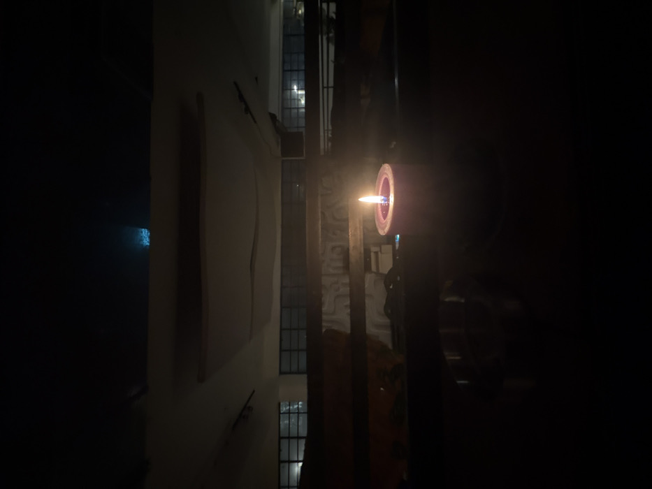 A dimly lit, vertically oriented shot captures an exterior space at night. A cylindrical object with a glowing center is visible on the right side, suggesting a light source. The architectural structure is a building with window patterns that extend upwards. The left side exhibits a lighter, more textured surface, potentially the side of another building. The darkness predominates the image, obscuring fine details.