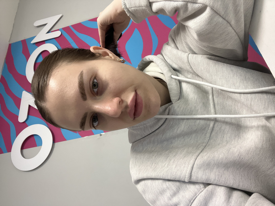 The image captures a woman in an indoor setting, identified as being in Rostov-on-Don, Russia. She is depicted from the upper chest, facing the camera directly with a neutral expression. She has fair skin, dark hair pulled back, light-colored eyes, and full lips. She is wearing a light grey hooded sweatshirt with white drawstrings. A small gold hoop earring is visible in her right ear. Her right hand is raised, holding a black comb or brush against the back of her head. The background consists of a light grey wall featuring a large, white "OZON" logo. Behind the logo, the wall is decorated with a wavy pattern composed of alternating bright pink and light blue stripes. A white surface, possibly a desk or table, is visible in the lower right foreground.