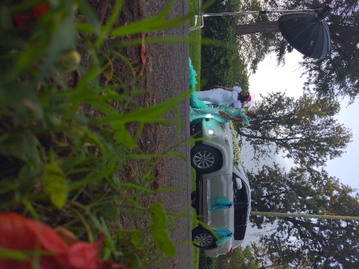 white SUV parked on the side of a paved road in New Hope, Tanzania, located at coordinates -3.275, 37.317. Two women are standing in front of the vehicle. The woman on the left is wearing a white dress, and the woman on the right is wearing a turquoise gown with a long train. The SUV is decorated with white flowers and a blue bow on the back. A large black umbrella is positioned on a tripod to the left of the image. The scene is partially obscured by foliage in the foreground, suggesting the image was captured from a low vantage point. The SUV is parked on the side of a paved road, and the grass and trees in the background suggest a rural setting.