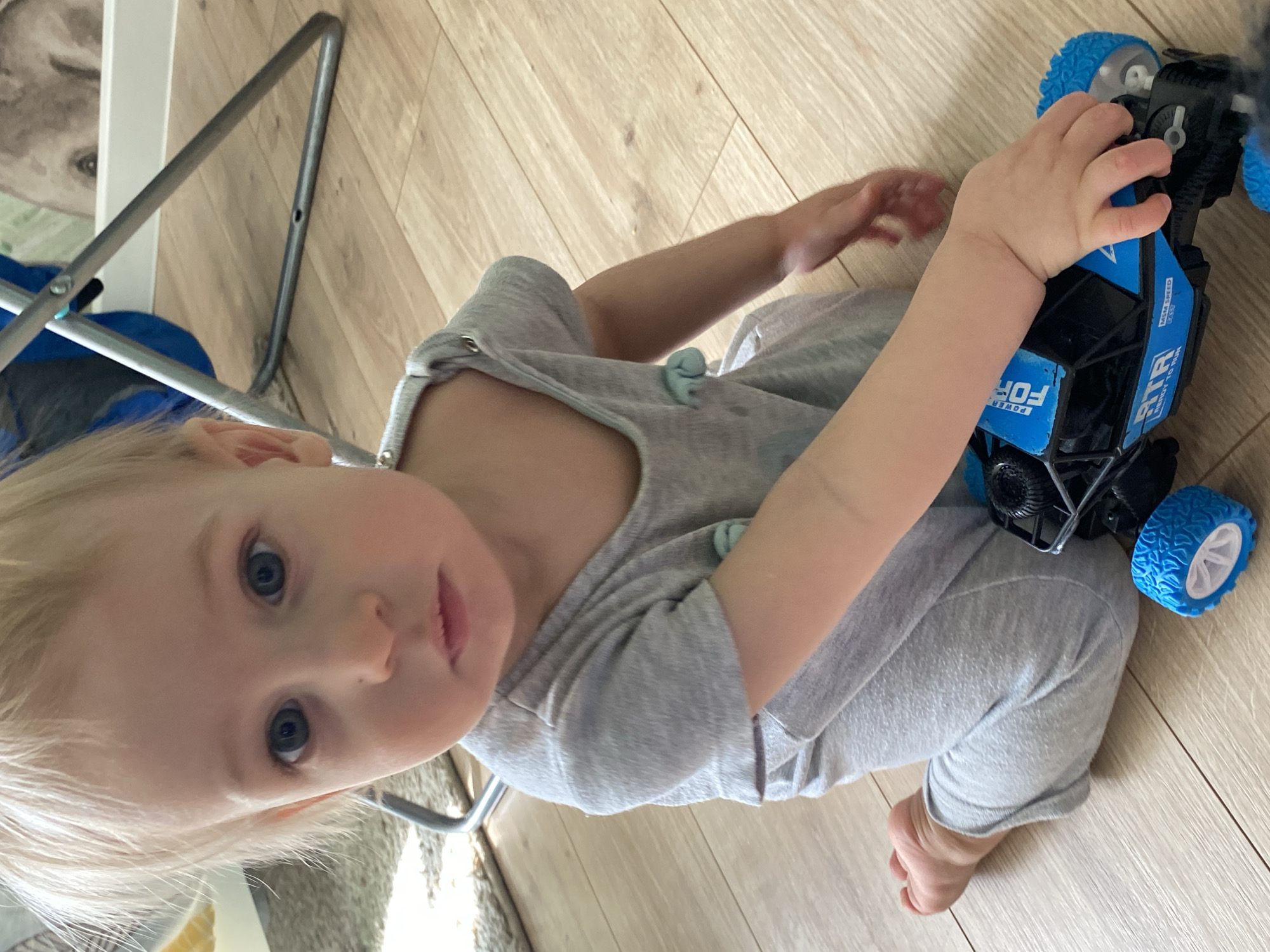 A toddler with blonde hair and blue eyes sits on a light-colored wooden floor, wearing a gray jumpsuit. The child is holding a blue and black toy truck with oversized blue wheels. A metal frame of a folding chair is visible to the left of the child. The location is likely indoors. There is no information to suggest this image was taken in the city of Chaikovsky, Russia.