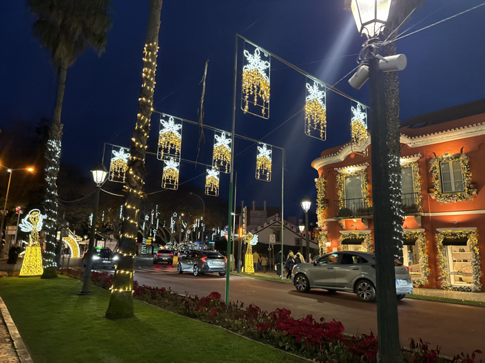The image depicts a nighttime street scene in Cascais, Portugal, heavily decorated for a holiday season