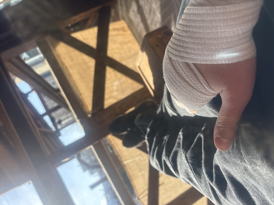 The image presents a first-person, downward-angled view of an individual's lower torso and left hand. The person is wearing dark, possibly denim, trousers and dark shoes, with their legs extended forward. The left hand is prominently featured in the foreground, wrapped in a beige elastic bandage covering the wrist and dorsal aspect, leaving the thumb exposed. Strong sunlight enters from the upper left, casting defined shadows from an interior wooden structural framework onto the surrounding surfaces and the subject's legs. This framework, composed of interlocking wooden beams, supports light-colored panels, creating a distinct geometric pattern of light and shadow. Through a window positioned in the upper portion of the frame, an exterior urban or suburban environment is visible under a clear blue sky. Distant building rooftops and chimneys are discernible, but no specific landmarks allow for a precise identification of the location within Sofia, Bulgaria. The overall scene suggests the individual is resting indoors on a sunny day.