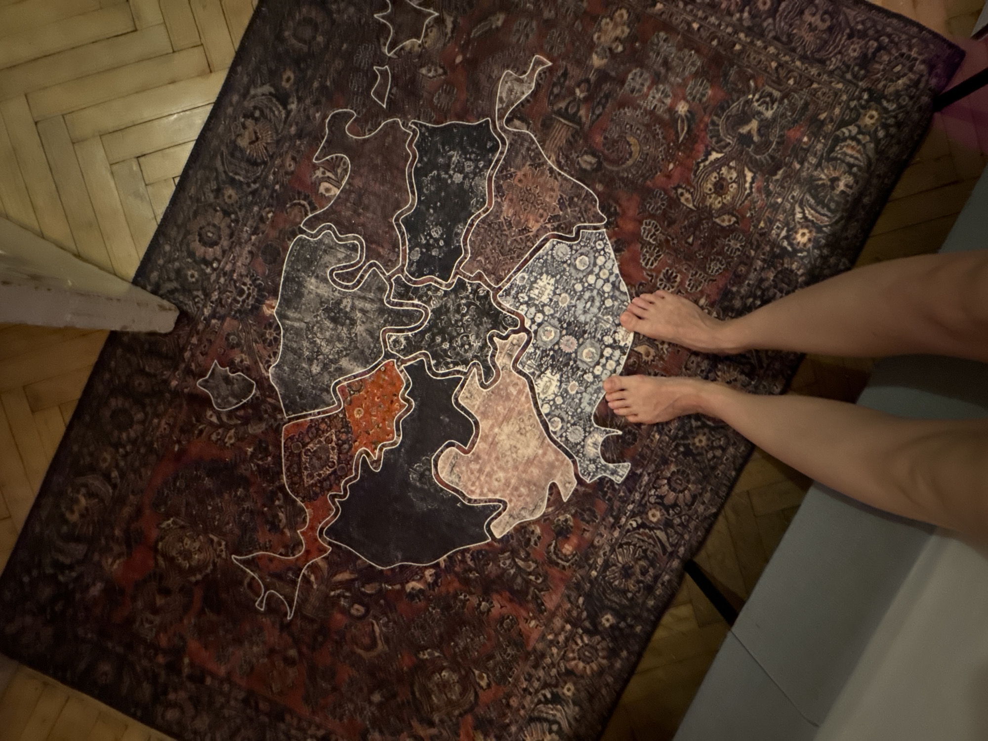 A medium-angle shot presents a patterned rug with a drawn white outline, resembling a crude, patchwork map, placed on a light-colored wooden floor. The rug's center is composed of varying patterns within the white outline. A person's legs and feet are positioned at the rug's edge. To the left of the rug, the wooden floor is visible, and a draped white fabric is partially visible on the left side. To the right, a blue or gray object is partially visible.