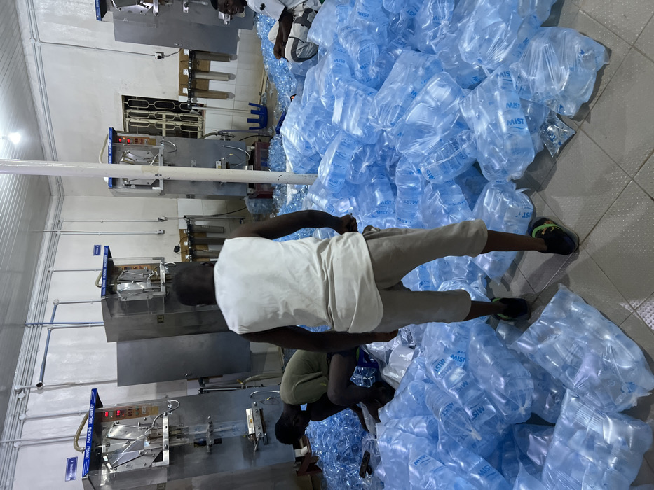 n indoor scene, possibly a bottling factory or packaging facility. Multiple individuals are present, seemingly working among piles of clear plastic bottles, labeled "MIST". There are also several stainless steel machines, which likely aid in the filling and packaging process. The lighting is bright and appears to be artificial.