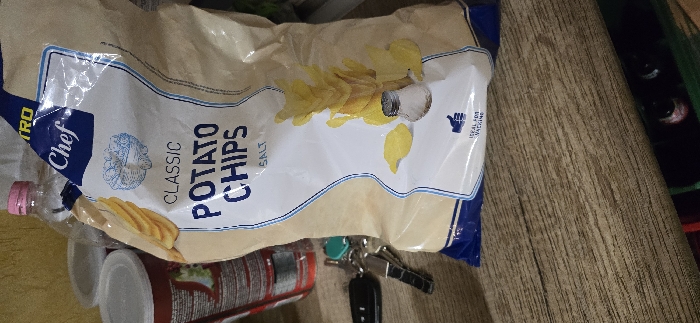 The scene depicts a collection of items on a wooden-textured surface, likely a countertop, within a building in Gurkovo, Bulgaria. A large, off-white bag of "Chef Classic Potato Chips Salt" dominates the center, featuring blue branding. To the left of the chip bag, a set of keys with a black remote fob and a turquoise key ring rests on the surface. Partially visible behind and to the left of the chip bag are a red cylindrical container with a white lid and a clear plastic bottle topped with a pink cap. The background is a plain, light-colored wall. Below the wooden surface, in the lower right, a dark object and a portion of a green plastic crate are discernible. No individuals are present, and all objects appear stationary.