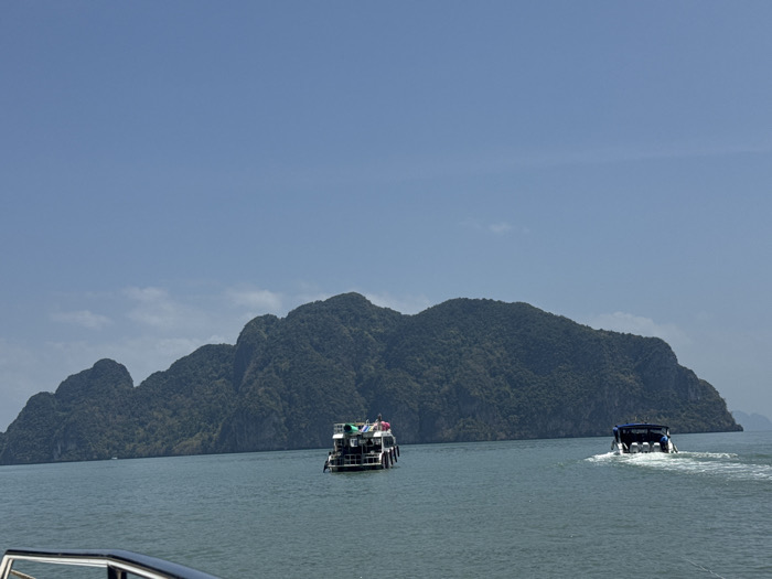 The scene depicts a coastal marine environment, identified as Krasom, Thailand. A large body of calm, dark blue-green water occupies the lower two-thirds of the image. The background features a sprawling, heavily forested island or mainland mountain range, characterized by steep, green-clad limestone karsts, beneath a clear blue sky with minimal, wispy cloud formations near the horizon. Two distinct vessels are present on the water. In the mid-left, a dark-colored, multi-decked tour boat, possibly a modified longtail, appears to be stationary or moving slowly. Approximately five to seven individuals are visible on its upper deck. In the mid-right, a smaller, dark-hulled speedboat is actively moving away from the viewer, producing a prominent white V-shaped wake. An estimated three to five individuals are discernible on this speedboat. The bottom-left corner of the foreground shows a partial view of a metallic railing, indicating the vantage point is from another boat or watercraft.