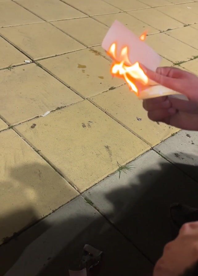 person holding a piece of paper on fire outside on a sidewalk. The person is holding the paper in their hand, and the paper is actively burning with a visible flame. The sidewalk consists of yellow, square tiles. There's some debris on the sidewalk, and one can see bits of other burnt papers on the bottom left, near the person's shoes. The background shows the edge of what might be a parking lot and a car. The overall lighting suggests it is evening or night.