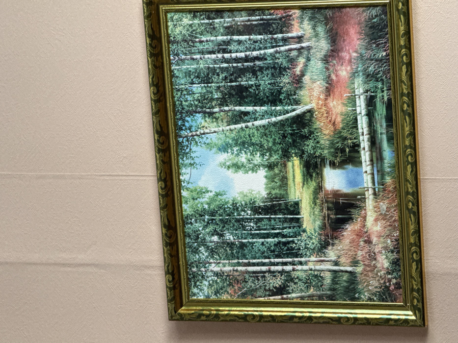 The image displays a framed landscape painting mounted on a textured, light beige wall