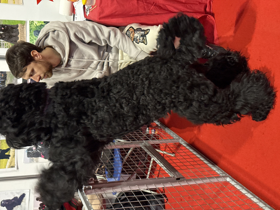 An indoor scene depicts a large, black, curly-coated dog standing on its hind legs, with its front paws resting on a silver metal mesh barrier. The dog is positioned on a red carpet. To the right, a Caucasian male with a beard and short brown hair is seated, wearing a light grey hooded sweatshirt and cream sweatpants featuring a graphic design on the right leg. He is looking at the dog. He is behind a table draped with a red tablecloth, upon which a white paper towel roll and a small yellow container are visible. In the background, posters with images of dogs are affixed to a white wall. A Fanta can is visible on the red carpet behind the barrier, adjacent to a blue chair. The setting is consistent with an exhibition or trade show, likely a dog show, located at the NEC Birmingham within the Metropolitan Borough of Solihull, United Kingdom.