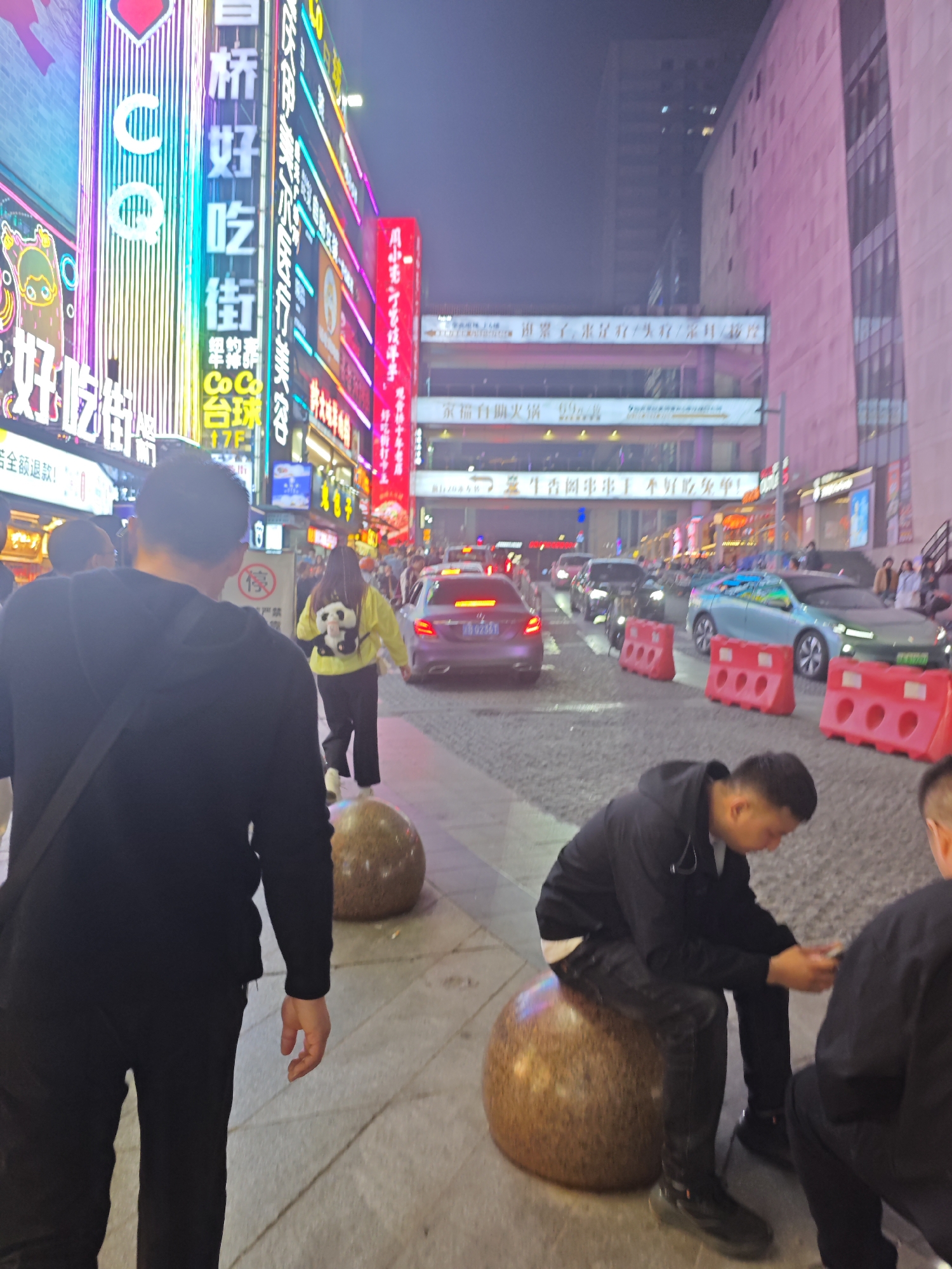 bustling street scene in the Liangjiang area of Chongqing, China, illuminated by vibrant neon signs. People are walking on the sidewalk. A man sits on a decorative stone sphere, using his mobile phone. Another man is passing by, with his back to the viewer. Further down the street, cars are driving, separated from the pedestrian area by orange barriers. The storefronts are adorned with Chinese characters and advertisements.