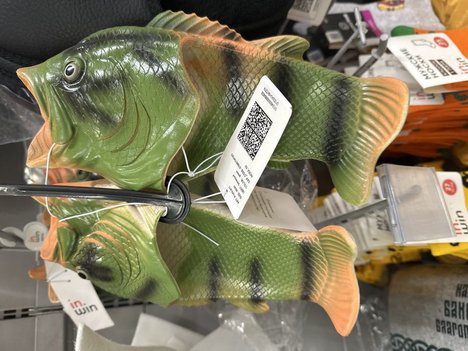 Two pairs of green fish-shaped slippers hang on a metal rack