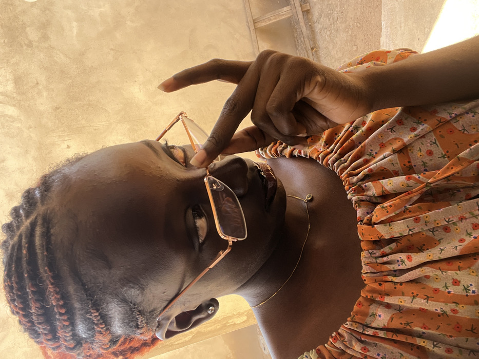 In the city of Rido, Nigeria, a dark-skinned individual is captured in a chest-up portrait. The subject has reddish-orange braided hair and a small, clear stud earring in the left earlobe. They are wearing rimless or thinly framed glasses with a rose gold-toned metallic frame. The individual's right index finger is positioned on the bridge of the glasses, seemingly adjusting them, as their gaze is directed slightly upwards and to the viewer's left. Dark, glossy product is applied to the lips. A delicate gold-colored chain necklace with a small, dark, possibly circular pendant is visible around the neck. The subject wears an orange-patterned garment with a gathered neckline, featuring small floral and striped designs in various colors including red, blue, and white. The background consists of a uniformly textured, light brown wall, out of focus, with a faint wooden structure visible in the lower right. The scene is illuminated by strong natural light.