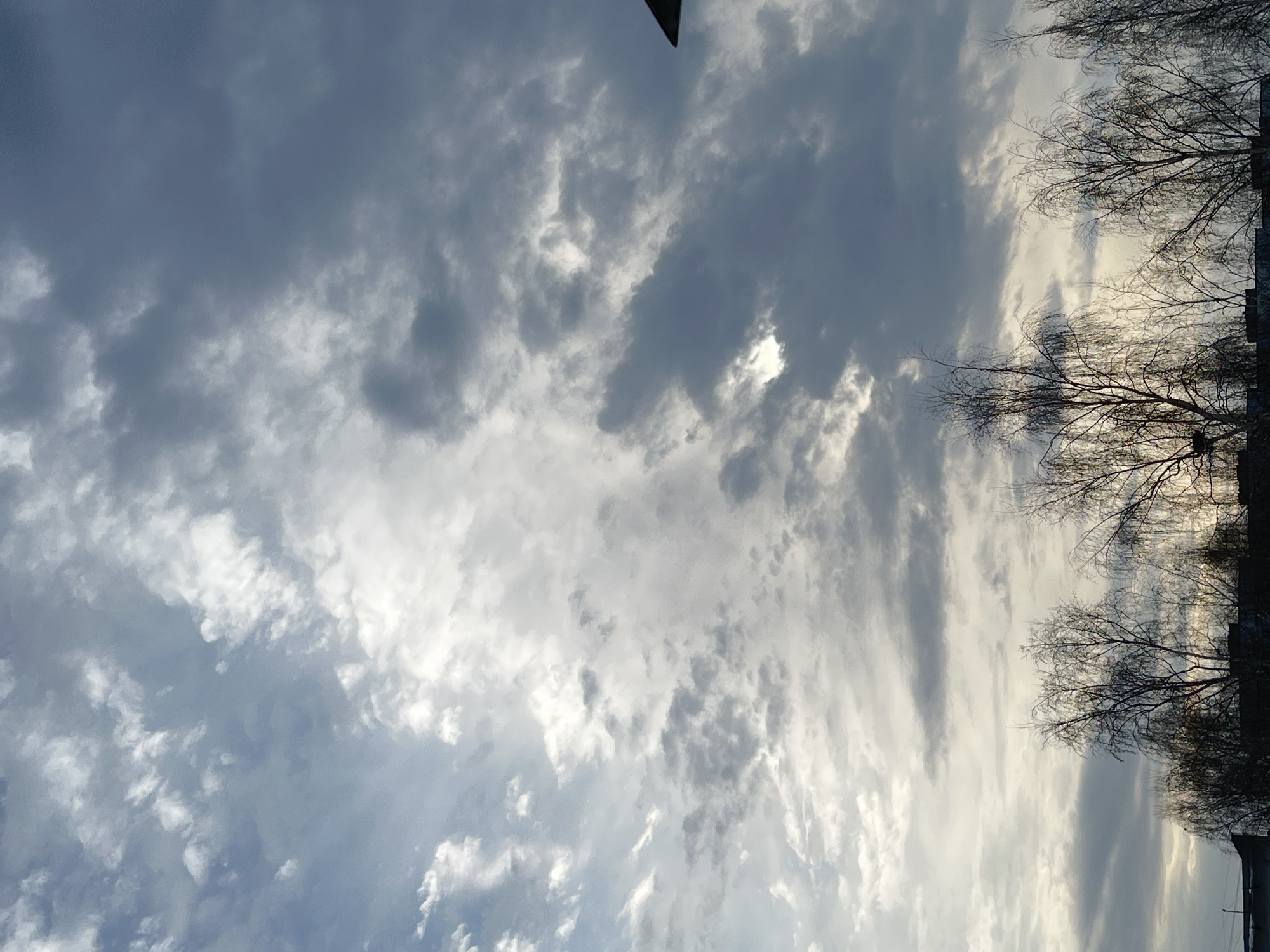 The image depicts a sky filled with layered clouds. The clouds range in color from light gray to dark gray, with some areas appearing almost white. Tree branches, without leaves, are visible along the right side of the frame. The photo seems to have been taken facing upwards. There are hints of buildings. Given the location Chaikovsky, Russia, the bare tree branches suggest either late autumn or winter conditions. The image predominantly features the sky and the bare branches, with suggestions of buildings in the bottom right corner. There are no people visible in the image.