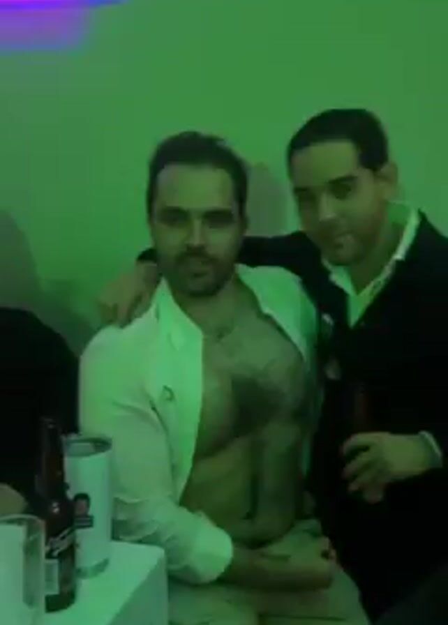 A man with a beard and open white shirt sits on a couch under shifting red, green and yellow lighting. A bottle of beer, a glass and a tall cup with a logo sit on the white table in front of him. Another man wearing a dark jacket stands next to him, arms around his shoulders and holding a beer bottle. The camera is handheld.