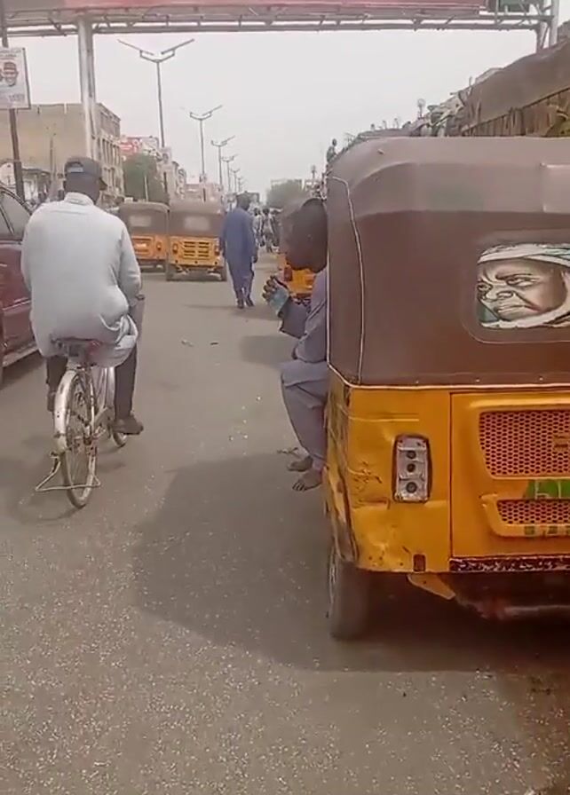 street in what appears to be an urban area in Africa. The street is paved and crowded with vehicles, including yellow three-wheeled auto rickshaws (tuk-tuks), a red SUV, and a bicycle. A man on a bicycle rides away from the camera, and several people are visible either riding in or sitting on the auto rickshaws. A man in a blue robe walks across the street in the middle distance. Overhead, a large billboard advertises "CREAMY RICH" with an image of a man and a Nescafe product. The sky is overcast, and the overall impression is one of a busy, moderately crowded urban environment.