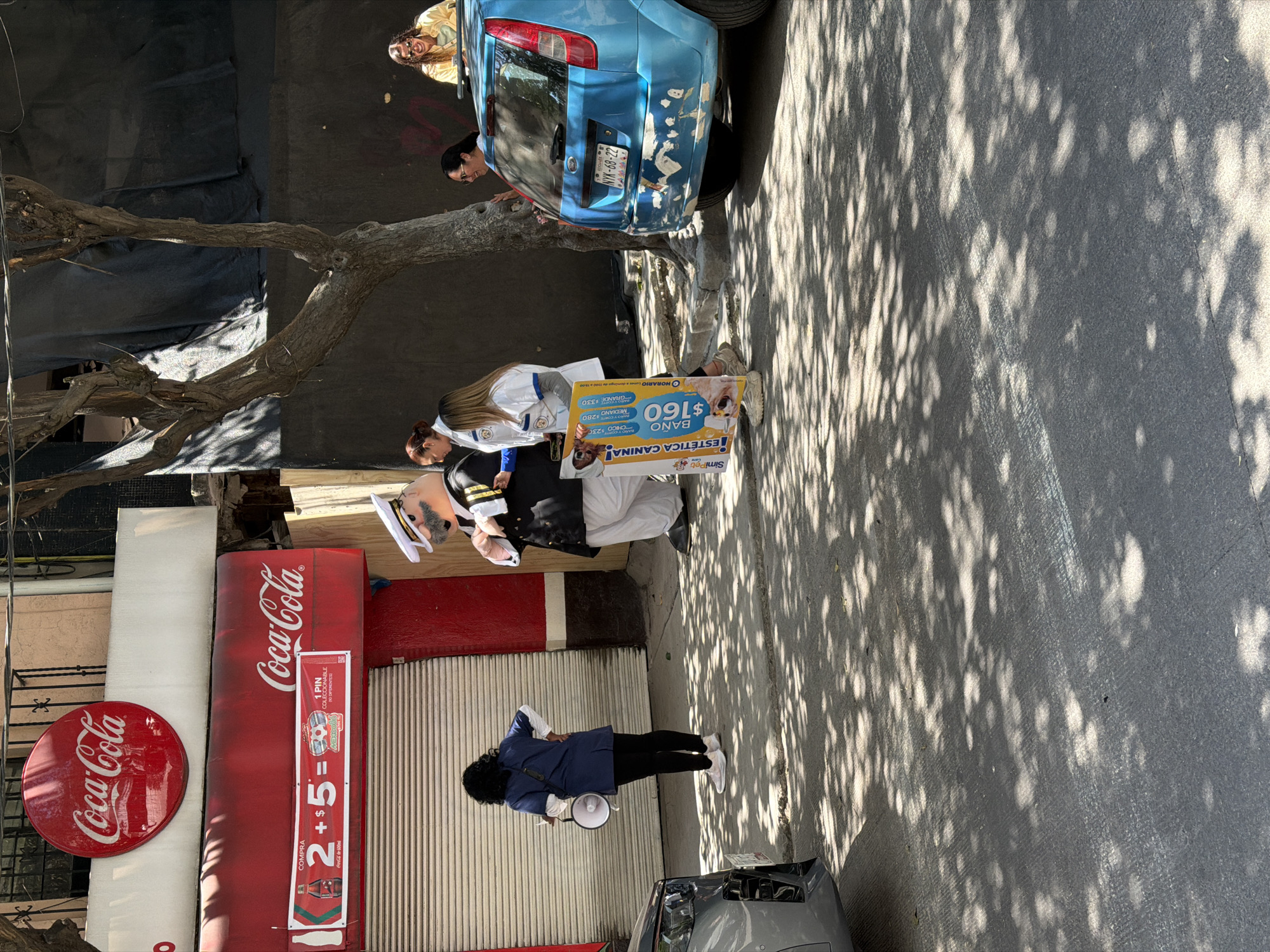 The image depicts a street scene in Mexico City, Mexico. A woman in a blue jacket holds a megaphone near a closed storefront, identified by a red Coca-Cola sign featuring a promotion for 2 sodas for $5. A person in a white coat and a dummy or mascot figure hold up a sign advertising "SimiPet" dog grooming services, with prices listed for different-sized dogs. A blue car is parked nearby, and a person stands near the trunk. The street is paved and dappled with shadows from trees. A tree is growing next to a building wall.