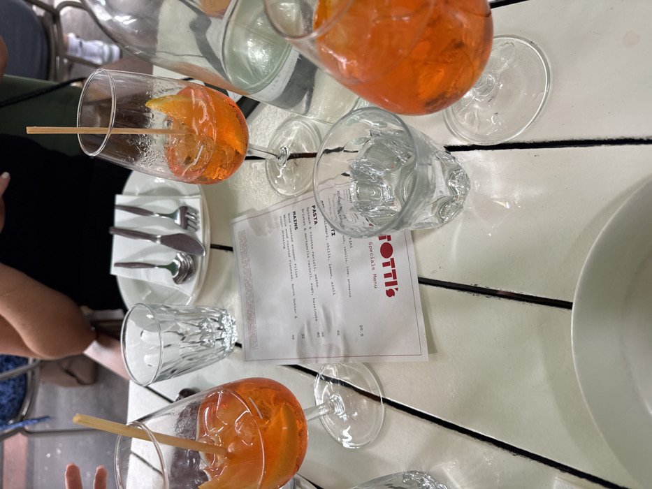 A restaurant table setting includes multiple glasses, some filled with orange cocktails and adorned with straws