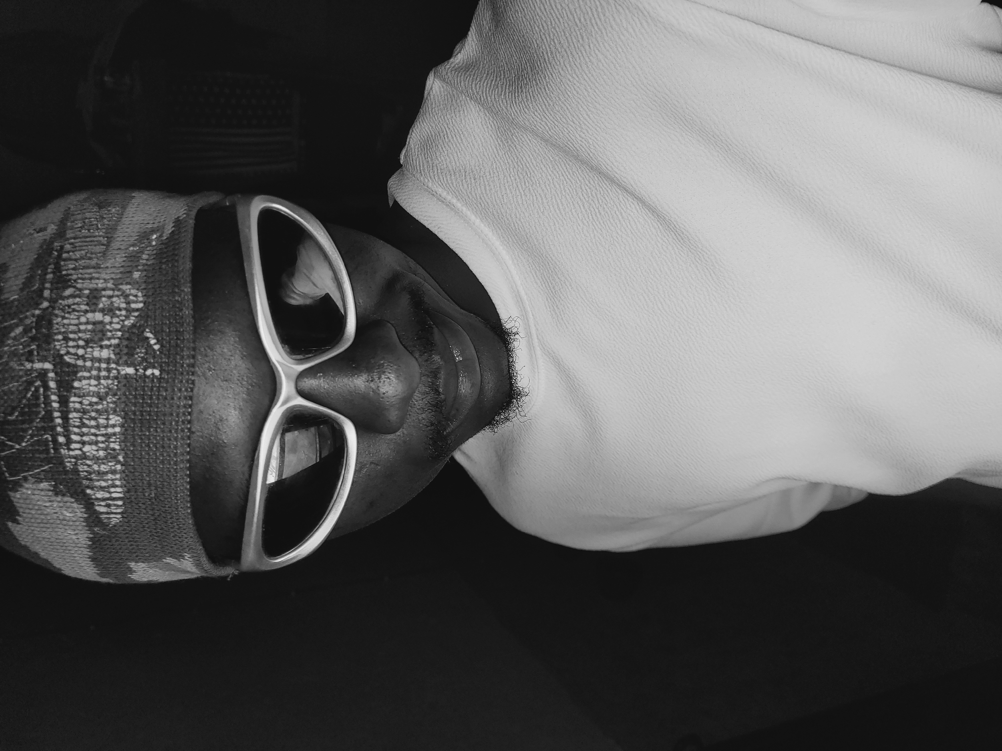 This black and white image features a close-up, low-angle portrait of an individual in Bukuru, Nigeria. The subject, appearing male, is shown from the upper chest, looking downward and slightly toward the camera. He wears a patterned knit beanie and silver-framed, wrap-around style sunglasses, which reflect ambient light sources and a partial hand. A mustache and a short goatee are visible, and his lips indicate a subtle smile. The subject is dressed in a light-colored, textured crew-neck shirt. The background is predominantly dark, with a faint, patterned object visible in the upper right quadrant.