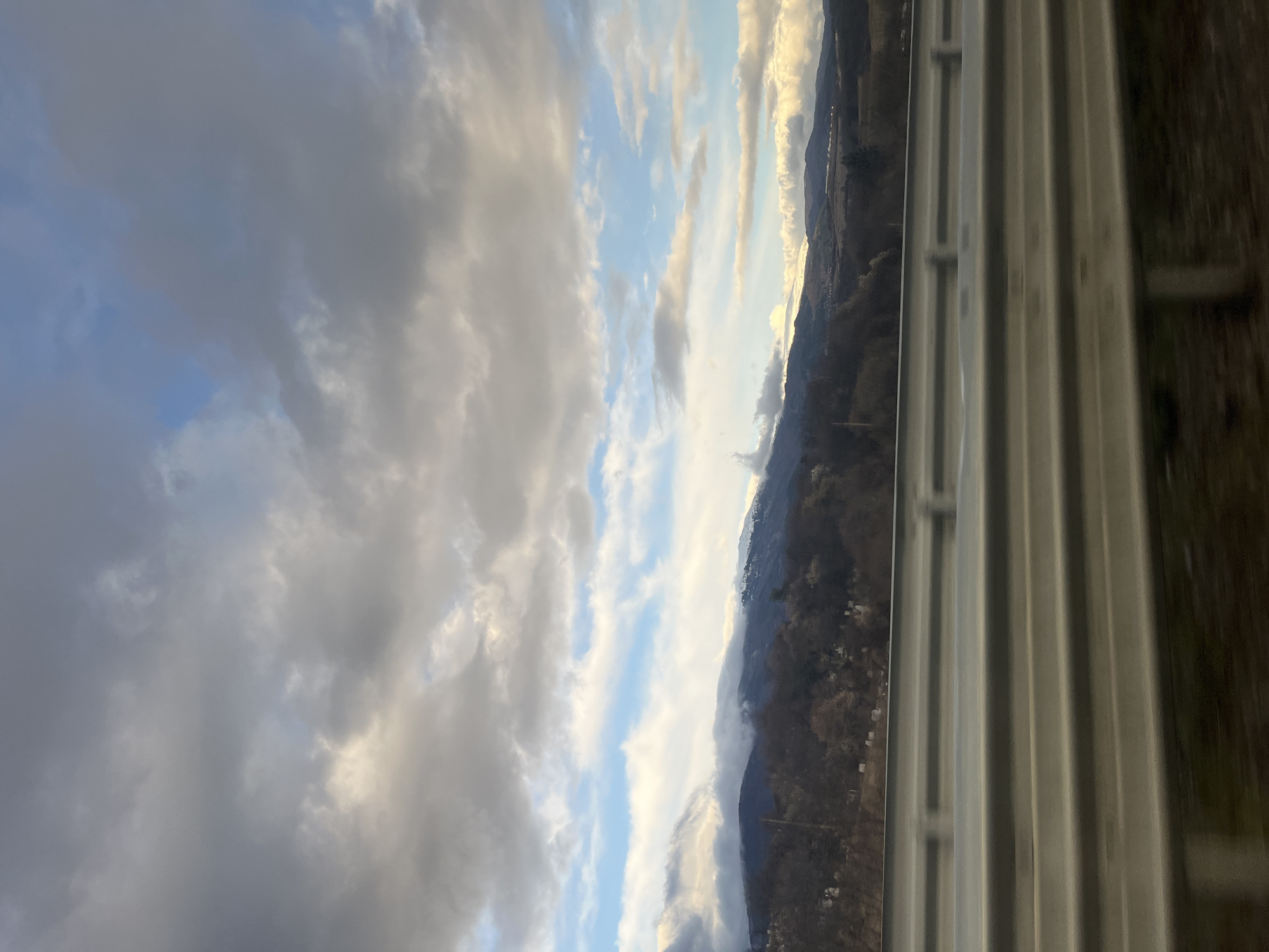 landscape with a mountain range on the right side and a sky with clouds filling the left side. A metallic guardrail runs vertically down the right side of the frame, obscuring the view slightly. The mountain appears to be covered in trees and some buildings. The sky is a mix of blue and gray clouds. The photo seems to be taken from a moving vehicle. The location is unspecified in the provided context, and therefore, cannot be specified as Pernik, Bulgaria.