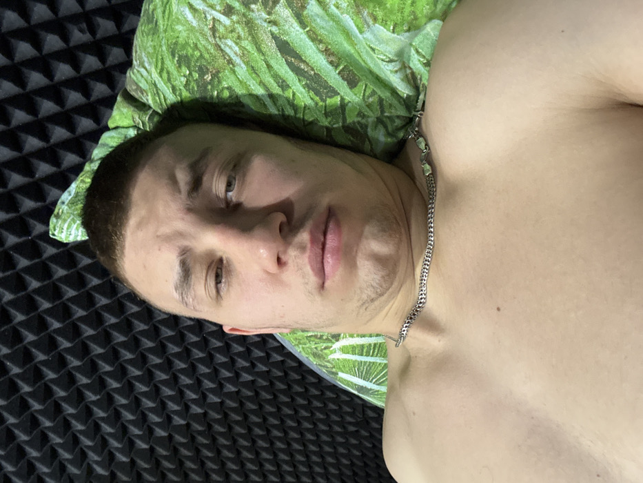 A man with short brown hair lies on his left side, resting his head on a green patterned pillow. He has light skin, dark eyebrows, and a serious expression. He wears a silver chain around his neck. The surface beneath him appears to be textured with a pattern of raised triangles. His chest and upper torso are visible, with the background shifting from a textured surface to the pillow.