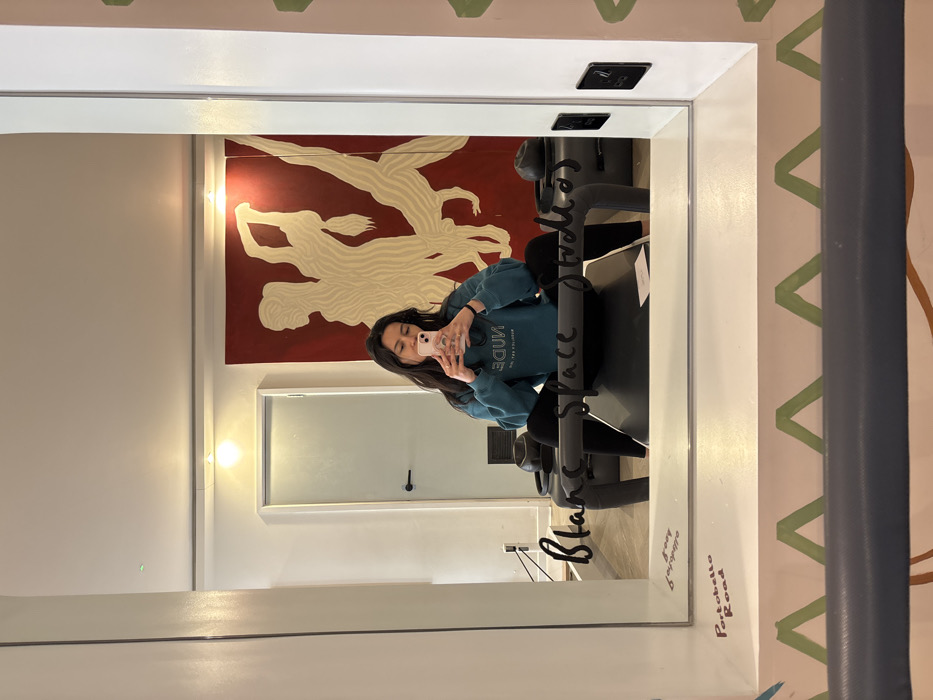 The image depicts a mirror selfie taken inside Blanc Studios, located on Portobello Road, London, United Kingdom