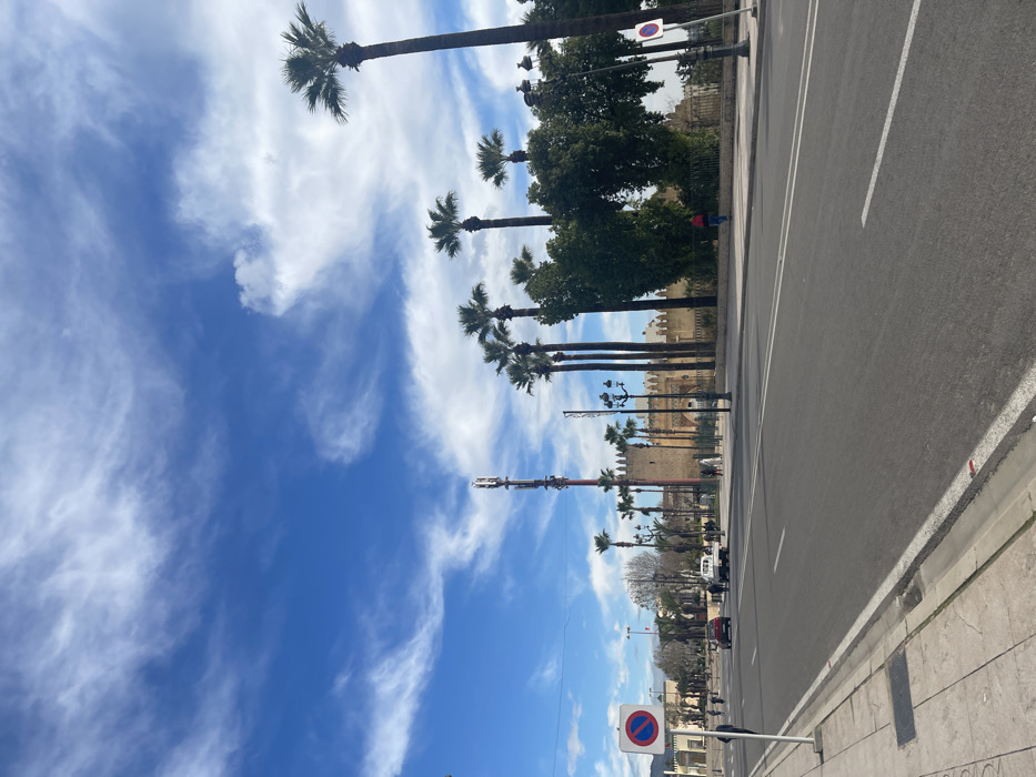 The image depicts a wide urban street in Mechouar Fes Jdid, Morocco, under a bright blue sky with scattered white cirrus clouds. The scene is observed from a slightly elevated position on a paved sidewalk, looking down a multi-lane road. In the immediate foreground on the left, a "No Parking" sign (red circle, blue background, red diagonal line) is affixed to a white pole. The sidewalk consists of light-colored tiles, bordering a dark gray asphalt road with clear white lane markings, including a solid white line separating two visible lanes and a continuous white line marking the road edge. In the mid-ground, a tall, slender cell tower with multiple antennas stands prominently on the left side of the road. Beyond this, a row of tall palm trees with green fronds lines the left side. On the right side of the road, another series of palm trees and dense green foliage is visible. Several black, ornate streetlights are positioned along the sidewalks on both sides of the street. Further in the background, a large, light brown fortified wall structure with crenellated battlements and an arched entrance dominates the right half of the image. This structure exhibits intricate decorative patterns. Behind a dark metal fence, more green trees and bushes are visible in front of the fortified wall. Sparse traffic includes a red sedan and a white pickup truck on the far-left lane in the distance. Several pedestrians are scattered across sidewalks and near the fortified wall; one individual wearing a red top and dark pants is walking on the right-hand sidewalk/raised area in the mid-ground. Mountains are faintly visible on the horizon to the far left. The overall environment suggests a well-maintained urban area with historical architecture and modern infrastructure.
