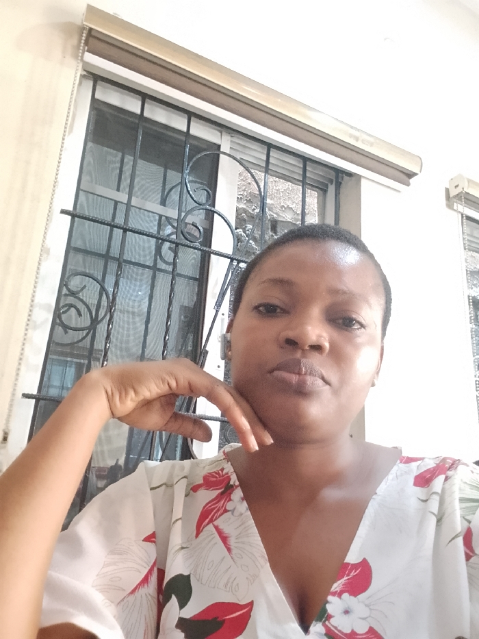 The image displays an adult female, likely of African descent, centered in the frame and looking directly forward