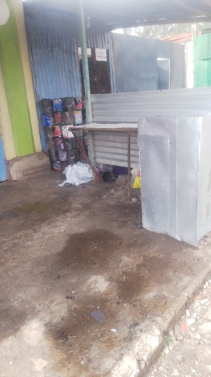 A corrugated metal structure houses stacks of paint cans. A table stands with a white bag underneath it, along with a black bucket and yellow plastic bag. The foreground depicts a dirt-covered surface leading to a slightly raised curb. A large, reflective metal box stands to the right of the table. The surrounding environment appears weathered and possibly rural.