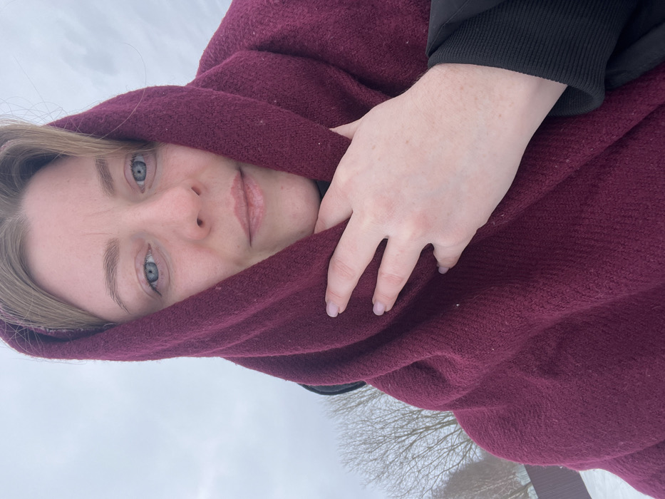 A close-up outdoor portrait depicts a light-skinned individual, likely female, in Kalinino, Russia. The subject faces the camera directly, displaying blue eyes, light brown hair partially visible at the top and sides of the head, and light-colored eyebrows and lips. A large, textured, maroon-colored shawl or head covering is wrapped around the head, neck, and shoulders, partially obscuring the lower face and chest. The subject's right hand, with light-colored fingernails, rests with fingers slightly spread on the maroon fabric. A black garment, possibly a jacket or sweater, is visible underneath the shawl, particularly the ribbed cuff of a sleeve on the right side of the frame. The background consists of an overcast, light gray sky. In the lower-left, bare deciduous trees are visible against the sky, with a dark-colored fence partially discernible beneath them. The ground is covered in snow.