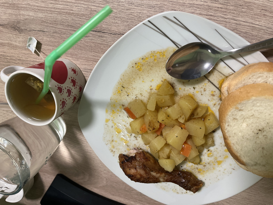 The image depicts a meal set on a light wooden surface, presumably within a residence in Vratsa, Bulgaria. In the foreground, a white, slightly curved rectangular plate holds a partially consumed roasted chicken drumstick on the left, a mound of seasoned, diced potatoes with visible carrot pieces in the center, and a silver-colored metal spoon resting on the lower right. The plate's surface is coated with a yellowish liquid, likely sauce or fat, and scattered dark specks of seasoning, along with small yellow granular elements. Two slices of white bread are positioned beneath the plate in the lower left of the frame. In the background, a white ceramic mug adorned with red heart patterns contains a light brown liquid (tea) with a tea bag and a green flexible plastic straw inserted. To its left, a clear glass contains water. A small, white paper tea bag tag lies on the wooden surface to the right of the mug. A dark, indeterminate object is partially visible in the upper left corner. No individuals are present in the scene, and no active actions are depicted.