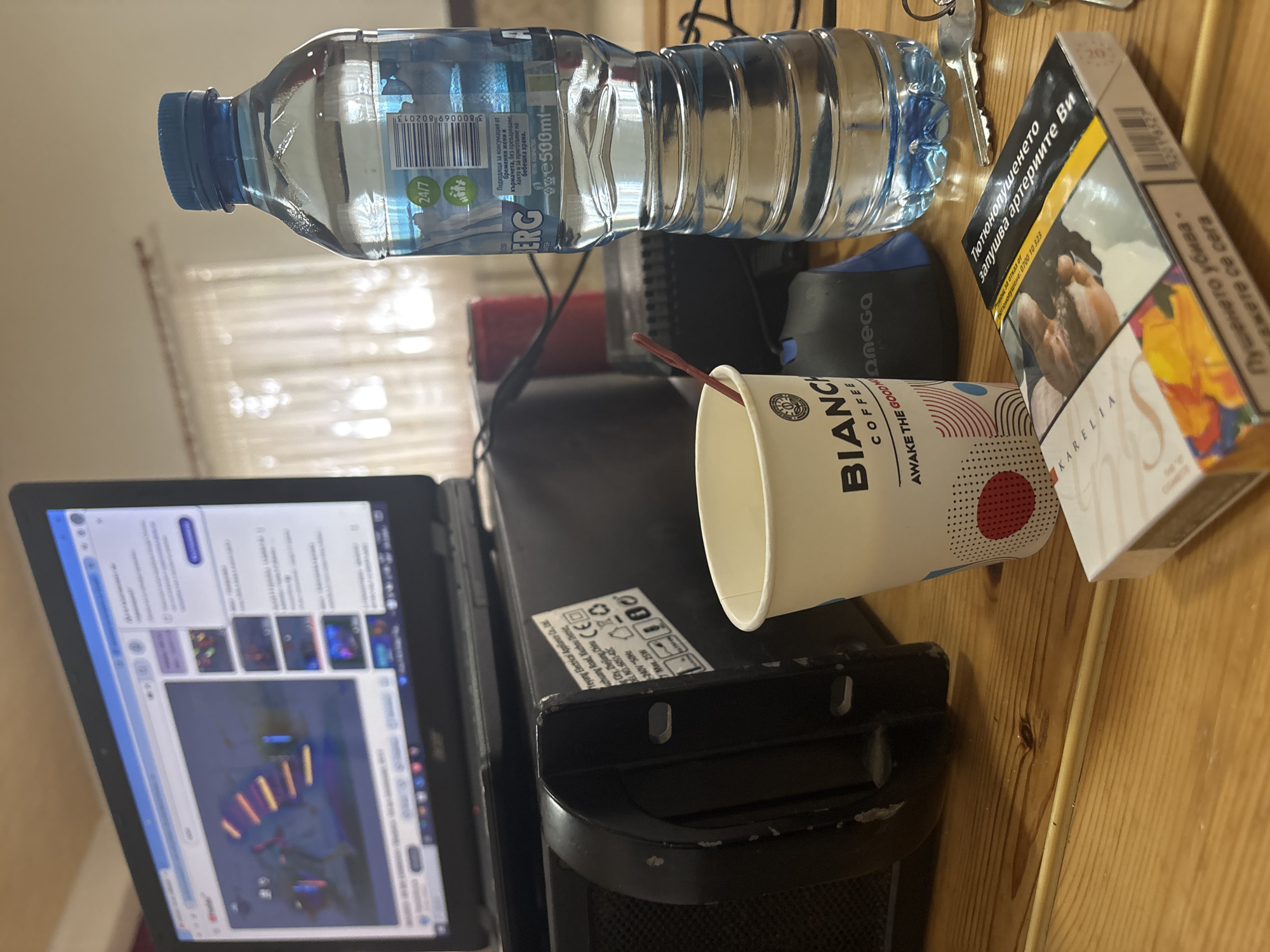 A medium shot captures a cluttered desk scene with a mix of personal and work-related items. A partially visible laptop screen displays a YouTube interface. A water bottle and a pack of cigarettes lie nearby, along with a paper cup of Bianchi coffee containing a stirring stick. The scene is illuminated by ambient light, with a window partially visible in the background. Based on the Cyrillic script on the cigarette pack and water bottle, it is likely the location is somewhere in Bulgaria, but there is nothing in the image that indicates the location is the city of Orizari.
