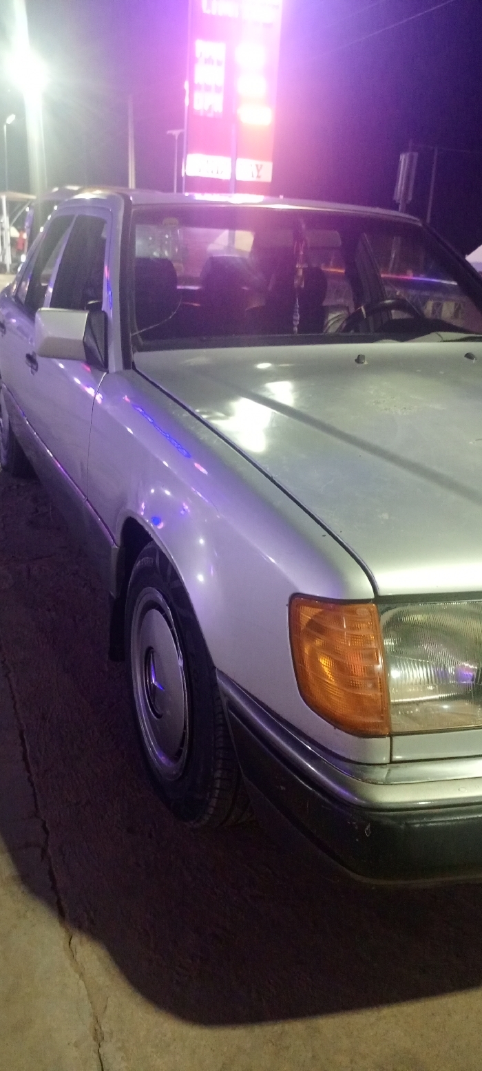 The image depicts a light-colored, likely silver, Mercedes-Benz W124 series sedan stationary at night in Rido, Nigeria