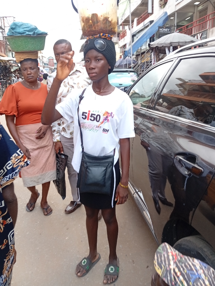 A young Black woman stands centrally in a busy street scene within Fegge, Nigeria