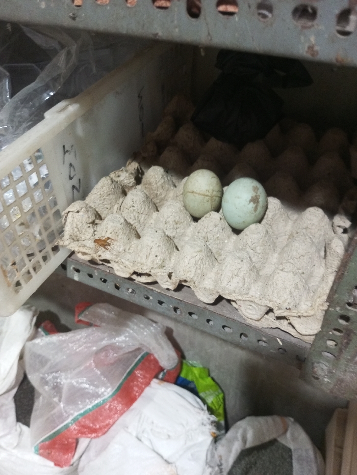 Two blue-green eggs rest in a gray cardboard egg carton on a metal shelf. The carton is full of empty egg holders and partially covered with dirt. A white plastic basket sits to the side, filled with plastic wrap. Below, bags filled with white and green materials litter the bottom shelf. A dark bag is faintly visible in the background on the shelf. The lighting is dim and the space appears cluttered.