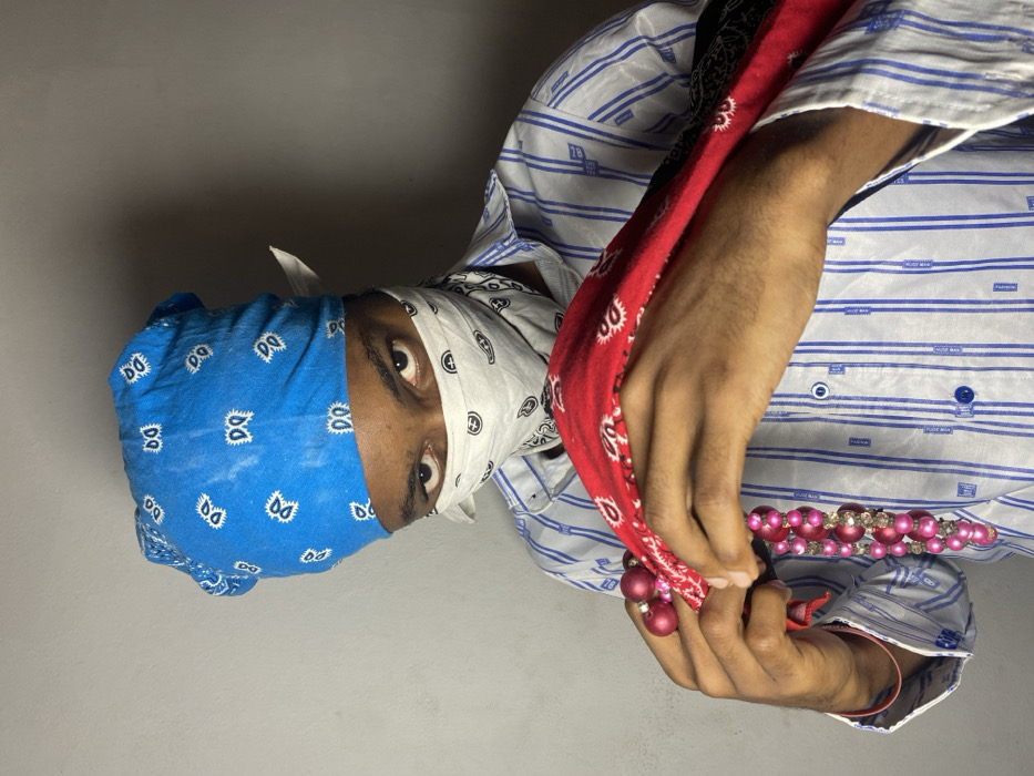 A photograph taken in Ngleshi Amanfro, Ghana, depicts a single individual from the chest up, positioned against a plain light gray wall. The subject's upper head is covered by a blue bandana with white paisley patterns, while the lower face is obscured by a white bandana with black patterns, revealing only the eyes, which are directed towards the viewer. The individual wears a light blue and white striped long-sleeved button-down shirt. Both hands are visible in the foreground, holding a folded red bandana with white paisley patterns. A strand of pink spherical beads interspersed with clear faceted beads is held in conjunction with the red bandana.