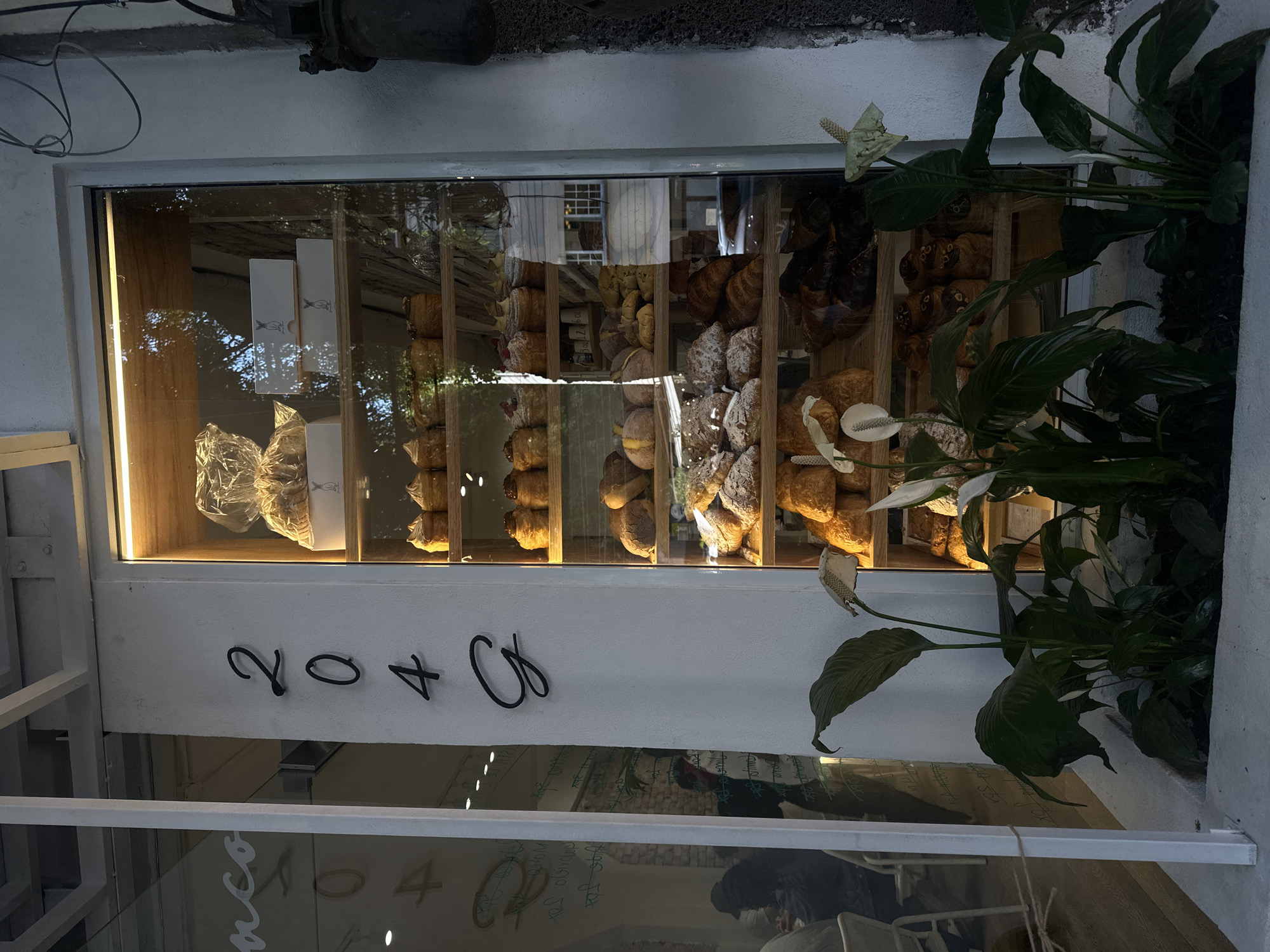 A bakery storefront in Mexico City, Mexico, displays an array of baked goods, including croissants and bread, behind a glass window. The address "204 C" is affixed to the front. A potted plant with white flowers adorns the side of the storefront. Reflections are visible on the glass, indicating the presence of people and the surrounding environment.