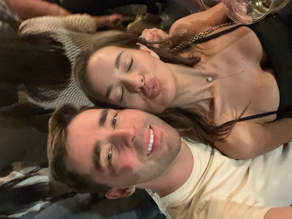 A close-up, selfie-style photograph depicts two individuals, a male and a female, posing intimately in a crowded, dimly lit social venue in Tel Aviv, Israel