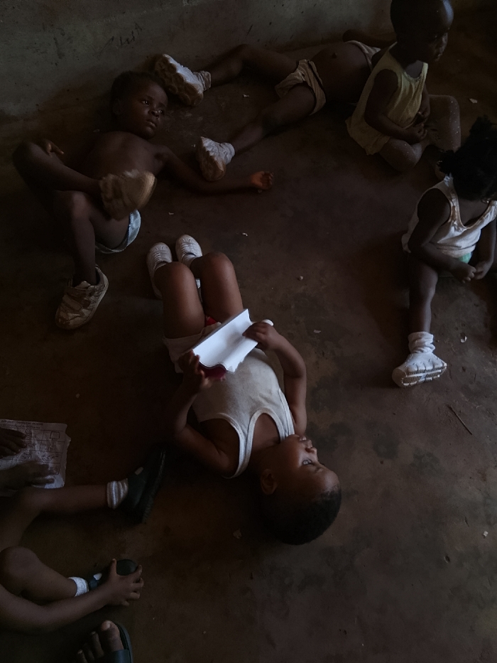 - "The scene, located in Ukwu-Abwa, Nigeria, captures six young children on a dirt floor within a dimly lit, enclosed structure with a visible unpainted wall to the left" by FM-0tnC43, licensed under CC BY 4.0