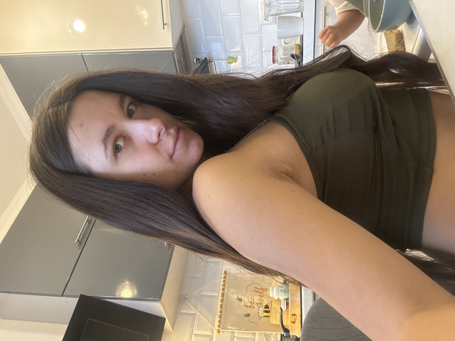 In a kitchen in Akulovo (Gp Kubinka), Russia, a female subject is depicted in the foreground, positioned at an angle facing the camera. She has long, dark brown hair, fair skin, and is wearing a dark olive green tank top. Her left shoulder and arm are prominent in the frame. In the background, a kitchen environment is visible, featuring white subway tile backsplash, dark gray and light beige upper cabinets, and a black range hood on the left. A white countertop displays various items including a decorative fabric hanging with "bee yourself" text and bee illustrations, a multi-tiered wooden tray with small containers, a red-capped jar, a white mug, and clear drinking glasses. To the lower right, a small child's hand is visible reaching towards a light blue bowl on the countertop.