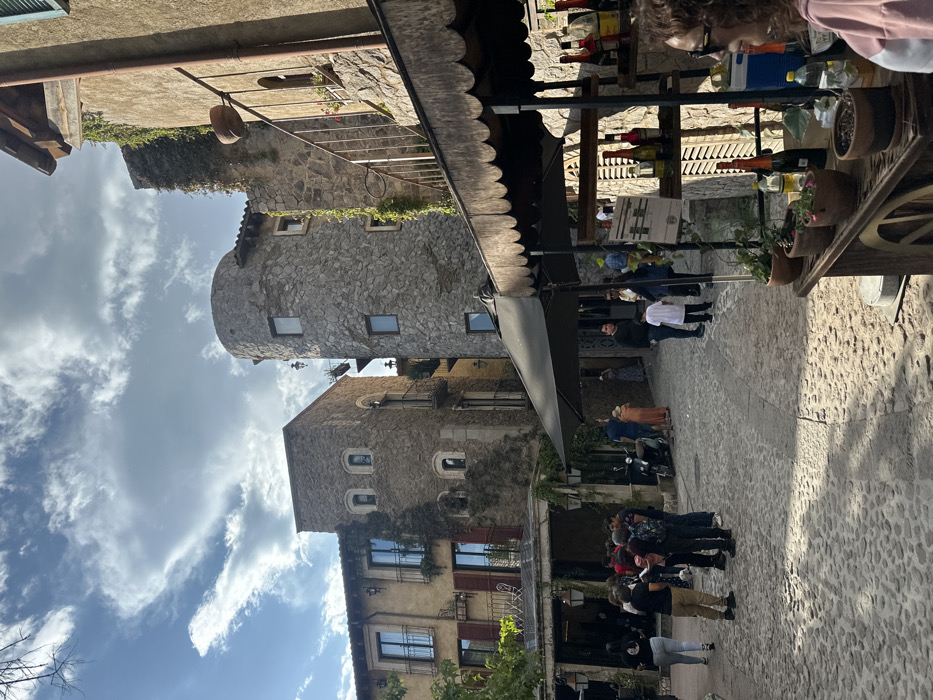 The image depicts an outdoor scene within a cobbled square in the city of Domingo Arenas, Mexico. The square is surrounded by multi-story buildings constructed from rough-hewn stone and stucco, featuring balconies, red-shuttered windows, and extensive green vine growth. A prominent cylindrical stone tower with small rectangular windows stands in the central-right. The ground is paved with irregular cobblestones, exhibiting areas of sunlight and shadow. Approximately 20-30 individuals are present, scattered throughout the scene. A group of 10-15 people are congregated near the entrance of a building on the left, which features an outdoor seating area. A light-colored scooter is parked on the cobblestones near the group. In the right foreground, a wooden market stall with a dark, scalloped canopy displays various bottles and multiple potted plants. A large black patio umbrella provides shade in the central area of the square. A woman with curly brown hair, wearing a light pink top, is partially visible in the far right foreground, facing left towards the market stall. The sky above is partly cloudy blue.