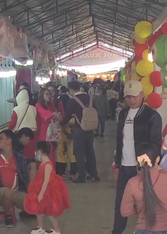 crowded market scene with people of various ages walking and standing. The market has a high, metal roof structure. There are balloons and decorations hung along the sides. The scene is bustling with activity as people browse the stalls. Some people are wearing traditional clothing, like a woman in a pink dress and a child in a yellow outfit with a hat. The floor appears to be tiled and clean, with some scattered debris. A man in a baseball cap and black jacket stands near the right side of the frame, interacting with someone seated on a blue stool. A young girl in a red dress twirls in the foreground.