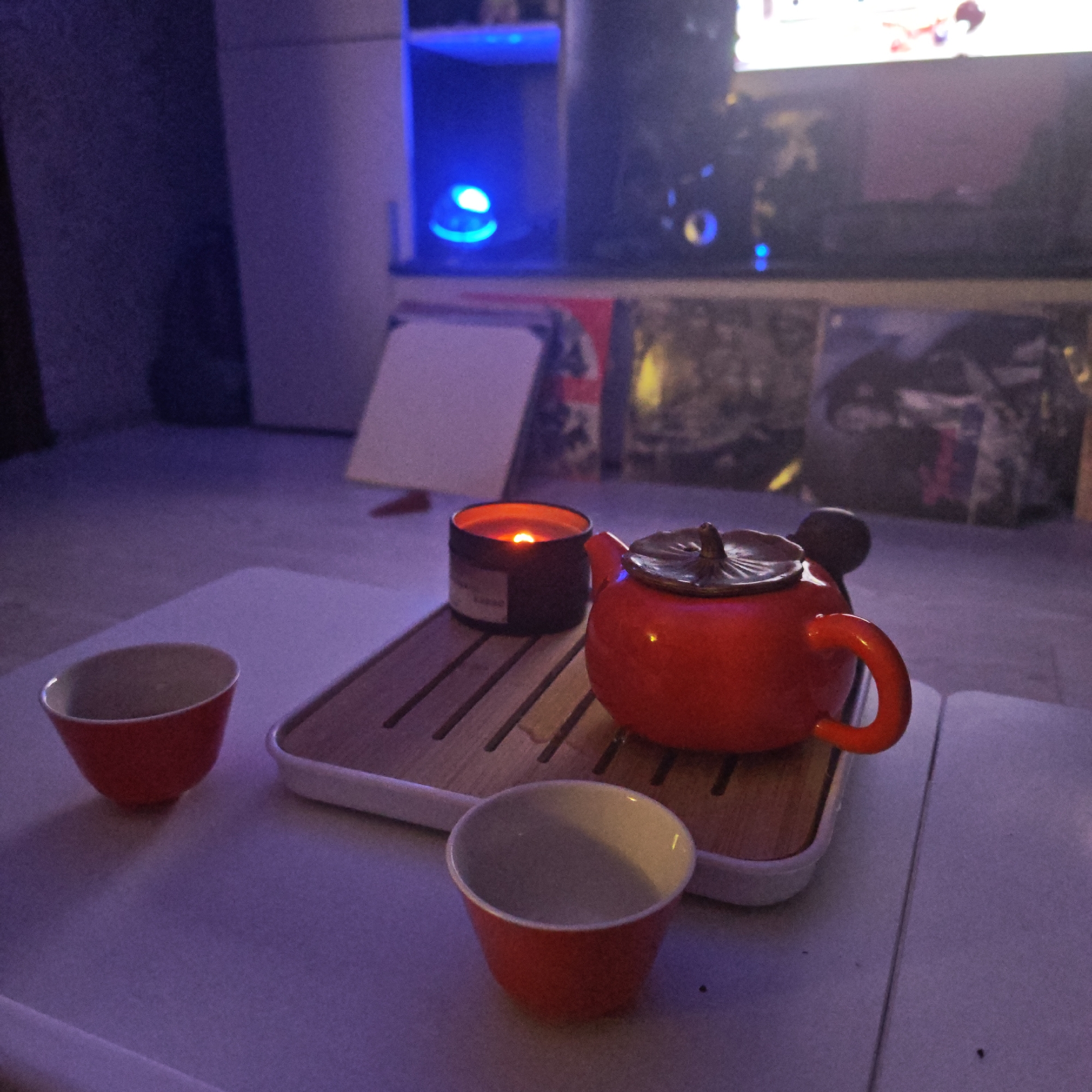 A low-angle indoor shot shows a tea set consisting of a red teapot with a bronze-colored lid, two small red cups, and a small burning candle on a wooden tray with a white frame