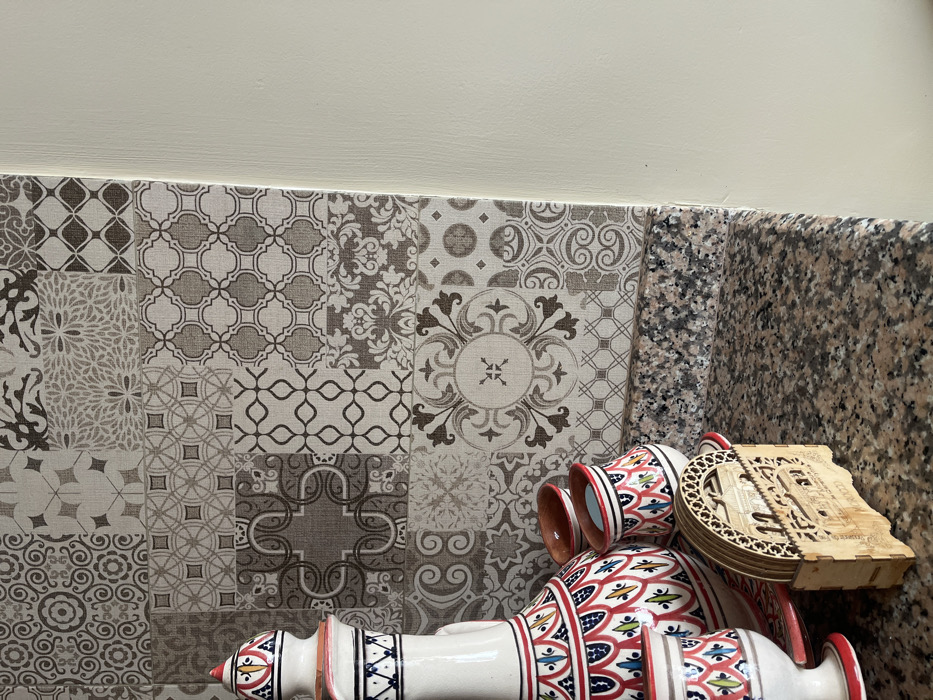 This image, captured in the city of Ameur عامر, Morocco, depicts an indoor counter setting