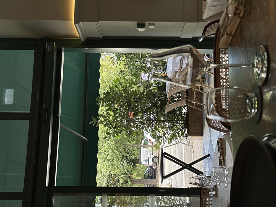 The image provides an interior view of a restaurant in Strasbourg, France, looking outward through a multi-paneled glass facade onto a city street. In the immediate foreground, a dark, polished tabletop holds an empty, clear stemmed wine glass positioned centrally and a shorter, textured tumbler resting on a dark coaster to its left. A dark, circular object, possibly a tray or plate, is partially visible at the bottom left. To the right, an interior wall features light-colored paneling with decorative molding, illuminated by a subtle upward light source along its top edge. A light brown, woven-back chair is partially visible in the mid-ground, inside the establishment. Beyond the interior, through the dark-framed glass doors, a dark green retractable awning is extended over an outdoor patio area. This patio contains several tables draped with white tablecloths and furnished with light brown, woven-style chairs. A large potted plant with dense green foliage occupies the center of the exterior view, partially obscuring the background. On the paved surface to the left of the patio, a black, X-legged foldable table stands. The background reveals a paved city street lined with mature green trees. Parked vehicles include a dark-colored sedan visible on the left side of the street and a white commercial van with "M. Olivier" text and a logo on its side, positioned further down the street to the right. The scene is devoid of people, presenting a static, prepared environment under natural daylight.