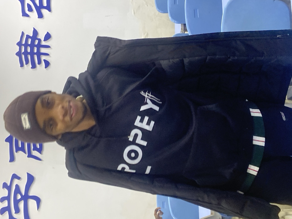 A man wearing a brown beanie, a black hoodie with "POPEY" in white letters, and a black jacket is sitting in a blue chair. He is slightly angled towards the camera, with part of a white wall behind him. The wall has blue Chinese characters on it. He is also wearing a pair of black pants with a striped belt.