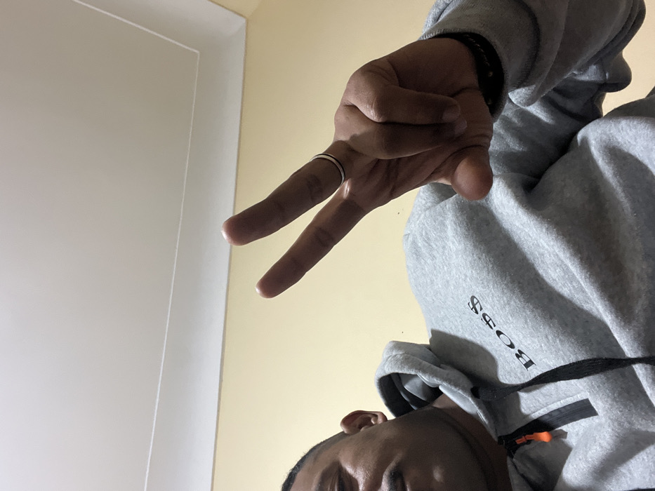 A low-angle shot features a person wearing a gray "BOSS" hoodie. Their right hand is prominently displayed, forming a "V" sign with the index and middle fingers. A ring adorns the index finger. The person's forehead and one ear are visible. The background includes a white door frame on the left, juxtaposed with a yellow wall in the upper right.